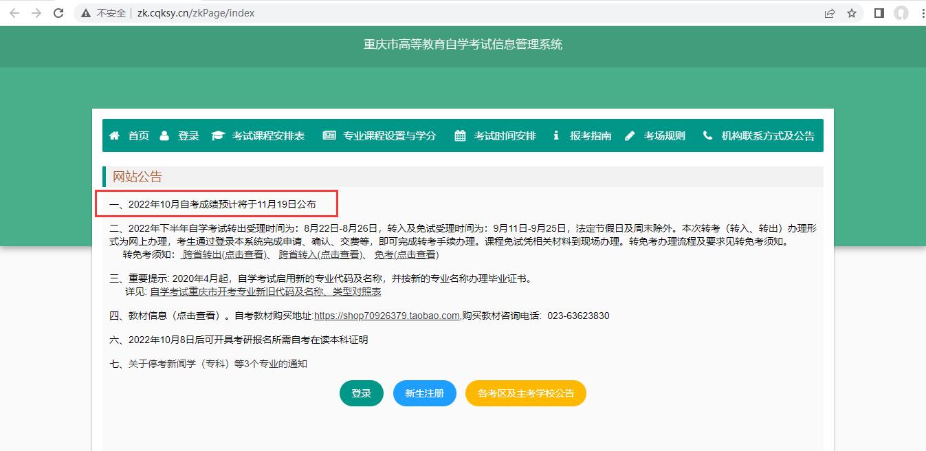 根据重庆市高等教育自学考试信息管理系统的公告,2022年10月重庆自考成绩已于11月19日公布。