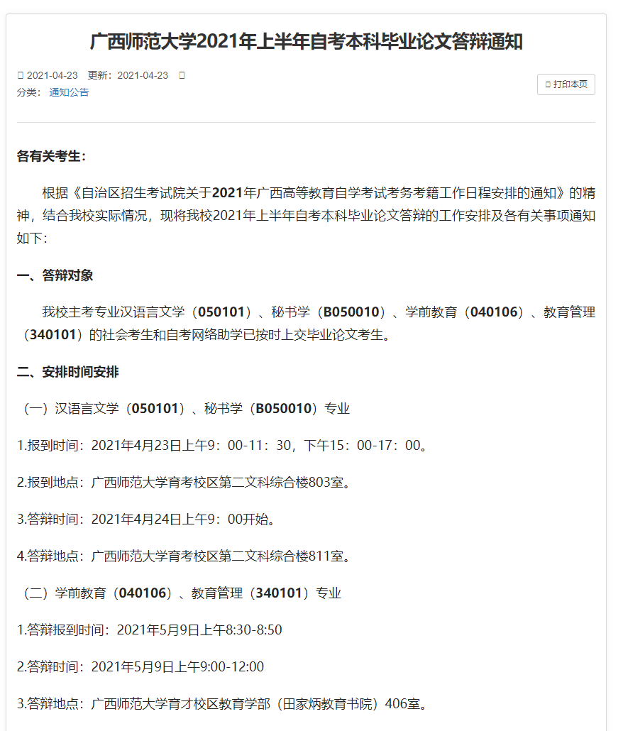 以广西师范大学为例,在发布的广西师范大学2021年上半年自考本科毕业论文答辩通知中,对于本校主考的各专业的毕业论文答辩的时间安排及注意事项等信息进行了说明。