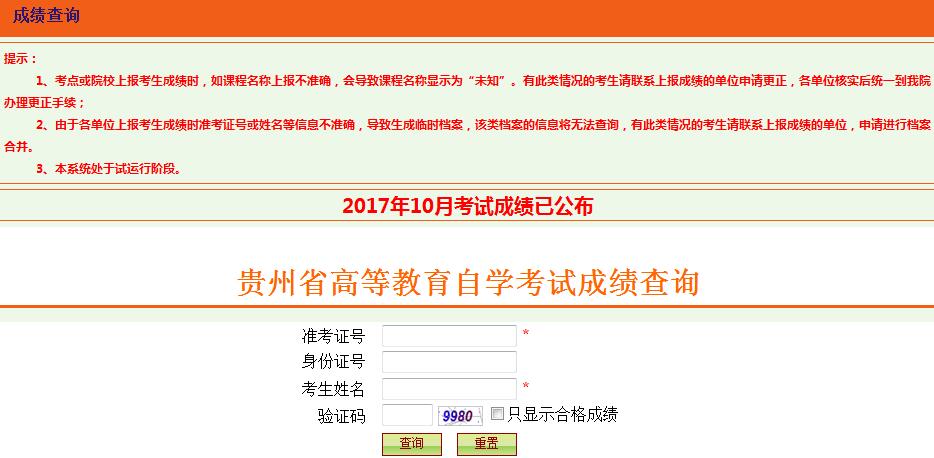 2017年10月贵州自考成绩查询入口已开通,考生可登陆网站:进行查询。