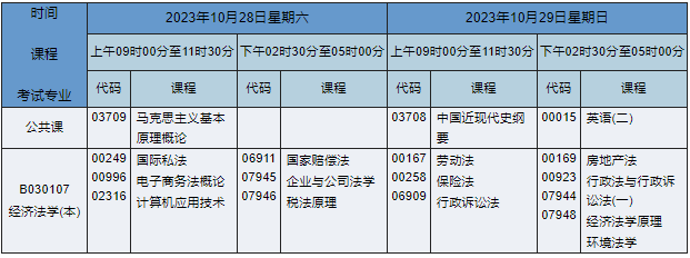 2023年10月湖南自考本科经济法学专业(专业代码:B030107)课程安排如下: