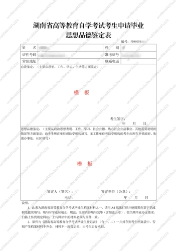 附件:1.《湖南省高等教育自学考试考生申请毕业思想品德鉴定表》(模板)