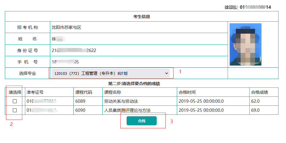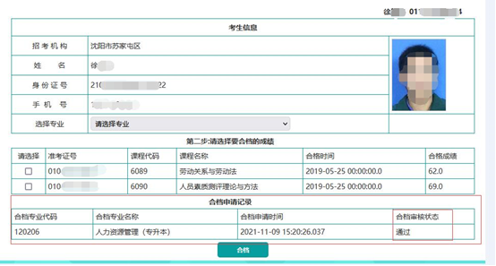 4.选择要申请毕业的专业,然后选择考生其他准考证号下的成绩,点击合档按钮提交合档申请。