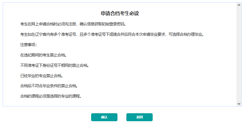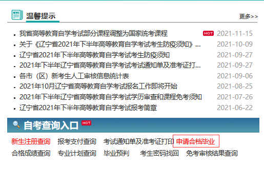 1.考生通过浏览器访问辽宁省高等教育自学考试网上服务平台后,点击自考查询入口中的“申请合档毕业”链接进行申请。