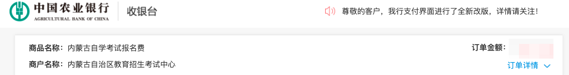 点击确认后,浏览器会打开新页面,农行收银台页面,在此页面可进行选课费用支付。