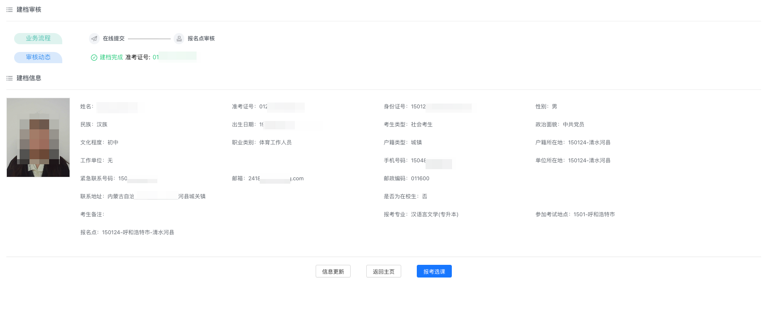 老考生在系统已有考籍,进入“自学考试网上报名系统”,页面入口显示为“考籍信息管理”。进入考籍信息管理,可点击“信息更新”按钮进行部分考籍信息资料更新。