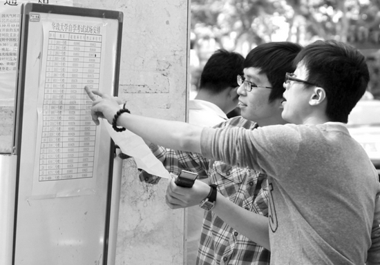10月20日,考生们在考场外核对自己的考试信息。当日,2012年高等教育自学考试开考,考试共持续两天。根据教育部网站通报的信息,全国有295万考生参加本次考试。