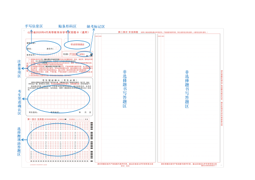 答题卡卡面包括手写信息区;贴条形码区;缺考标记区;注意事项区;考生笔迹确认区;选择题填涂答题区;非选择题书写答题区等部分。样卡如下: