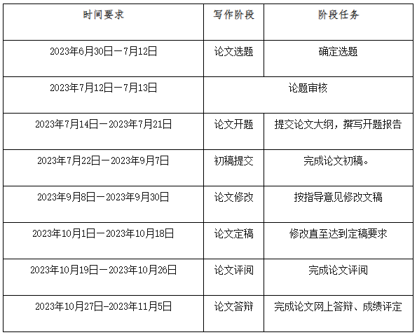注:为保证论文写作有序进行,请各位考生严格参照以上时间完成论文写作及答辩,若因特殊原因(提交证明)未能按照以上时间完成,考生须确保在10月19日(论文评阅日)前取得指导教师给出的合格论文成绩,否则论文成绩按不合格处理,不进入评阅环节。