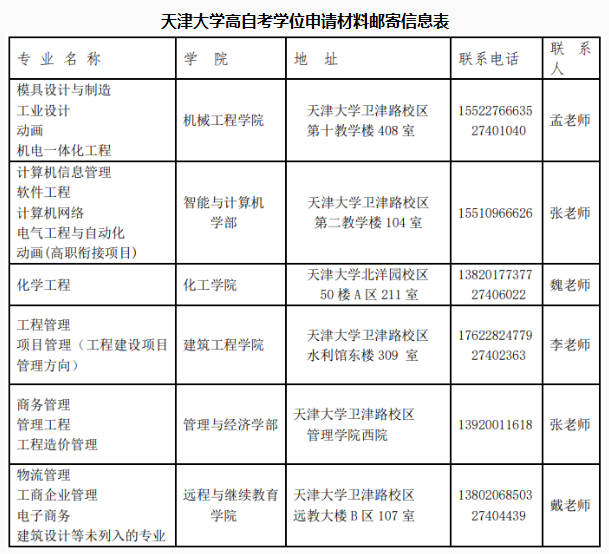 具体收件地址、联系人、电话等信息详见下表,请考生按照申请学位专业选取地址进行邮寄。